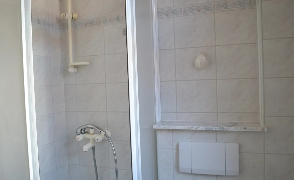 Für zwei Gäste kann bei Bedarf im Wohnbereich die Couch aufgebettet werden. Weiterhin können ein kleines Kinderreisebett und ein Hochstuhl auf Wunsch kostenlos bereit gestellt werden. Das moderne Bad ist mit Dusche, WC und Waschtisch ausgestattet und verfügt über Tageslicht.