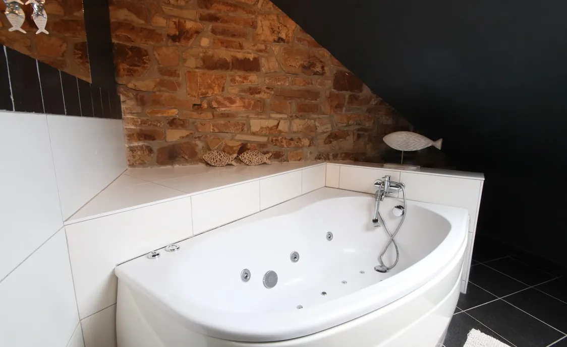 - Badezimmer: Whirlpoolwanne für 2 Personen und ein Waschbecken