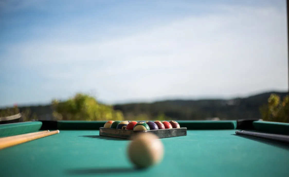 Der erste Bereich ist ein gemauerter Grill mit pizza Ofen und einen Esstisch. Der zweiter Bereich besteht aus dem privaten Pool, die aussendusche, die Sonnenliegen und die Sonnenschirme. Der 3. Bereich ist überdacht und besteht aus einem Billiardtisch und einem Tischtennistisch.
