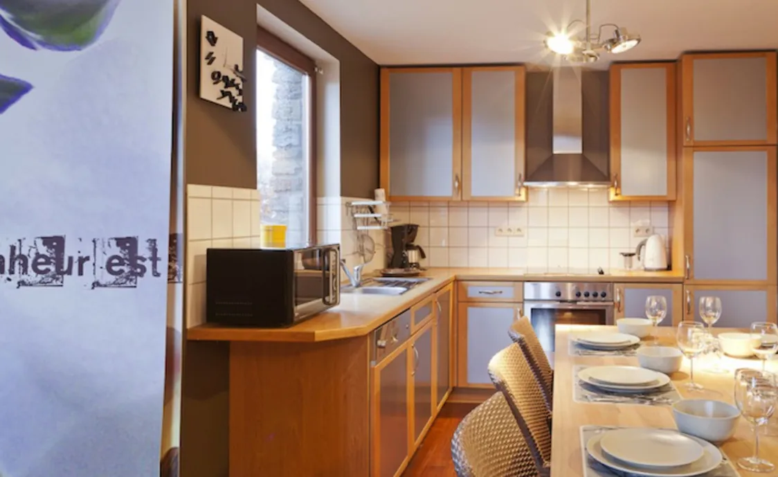 - Ausstattungen: Backofen, Elektrische Kochplatten, Gefrierschrank, Geschirr und Besteck, Geschirrspüler, Kaffeemaschine, Kochplatten, Küchenutensilien, Kühlschrank, Mikrowelle