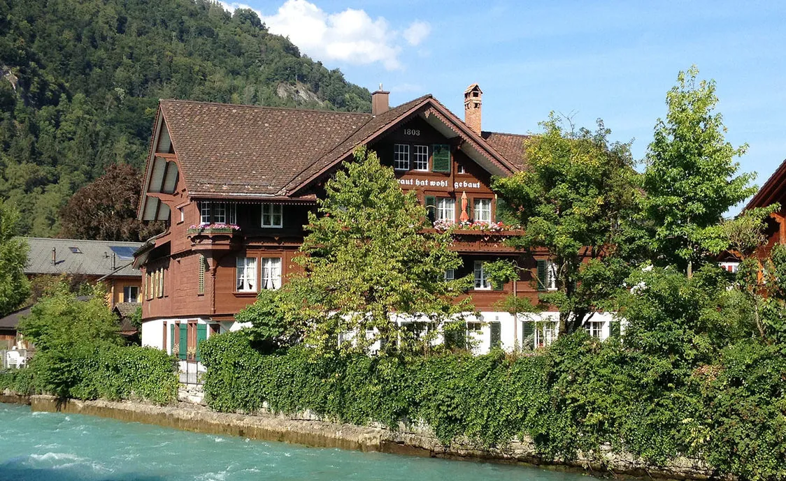 Das 200-jährige denkmalgeschützte Schleusenhaus liegt direkt an der Aare mitten in Interlaken, Berner Oberland (Schweiz).