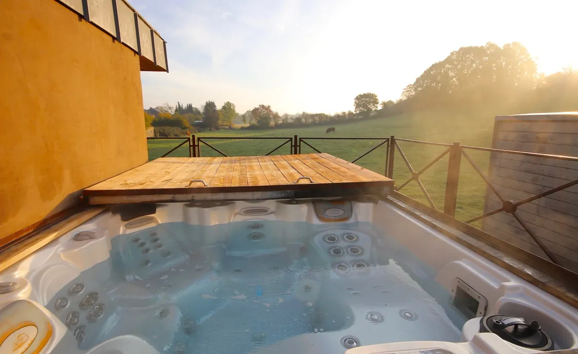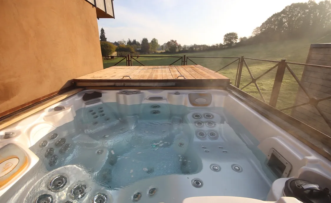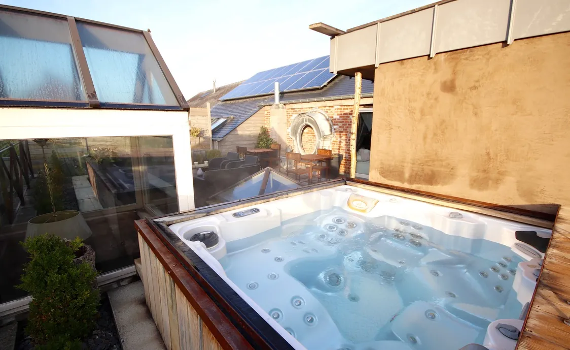 Die Suite mit Außenwhirlpool, der gemeinschaftlich während der Öffnungszeiten des Wellnesszentrums genutzt werden kann und privat nach Schließung des Instituts, befindet sich auf der ersten Etage.