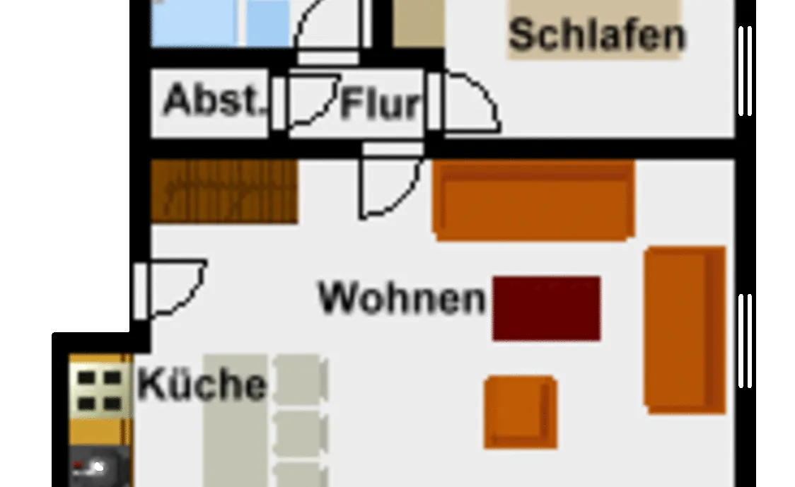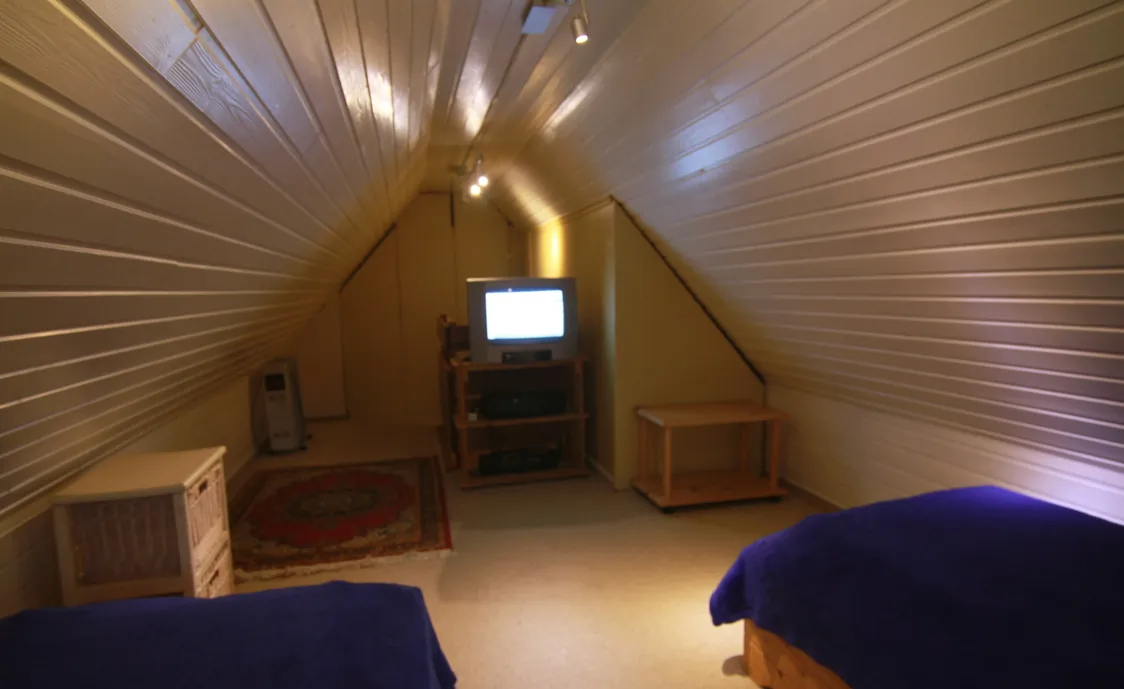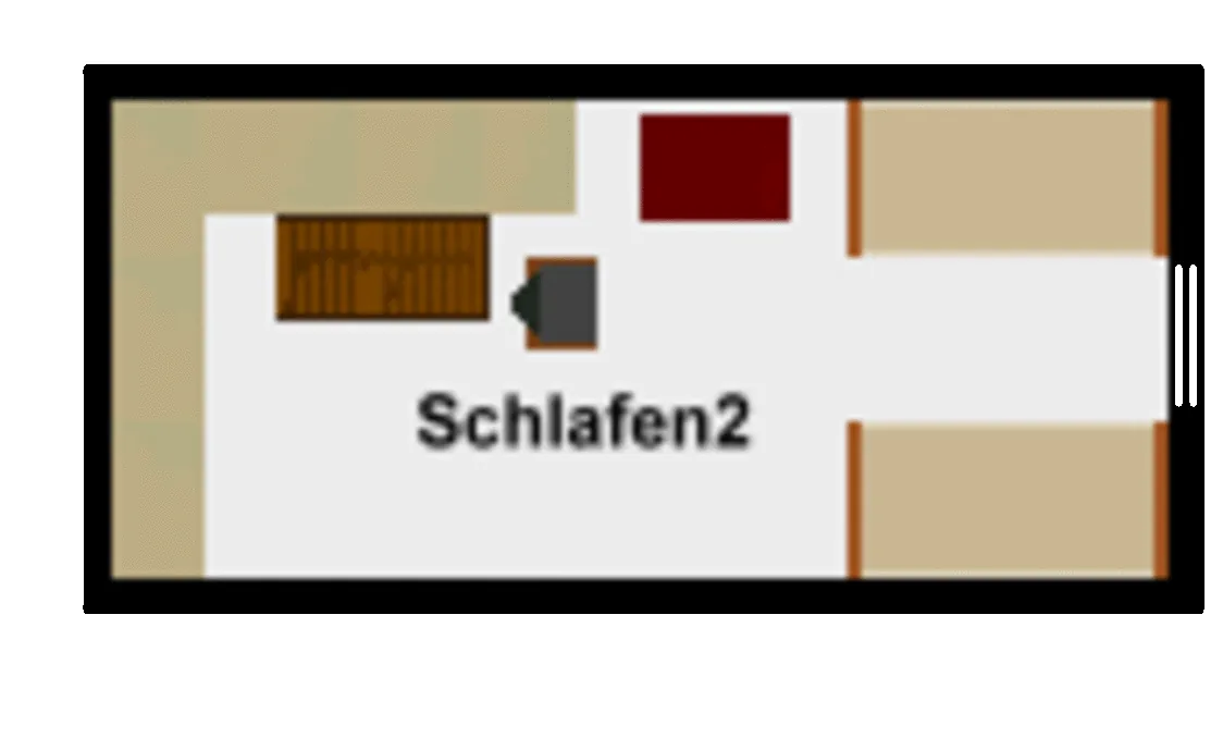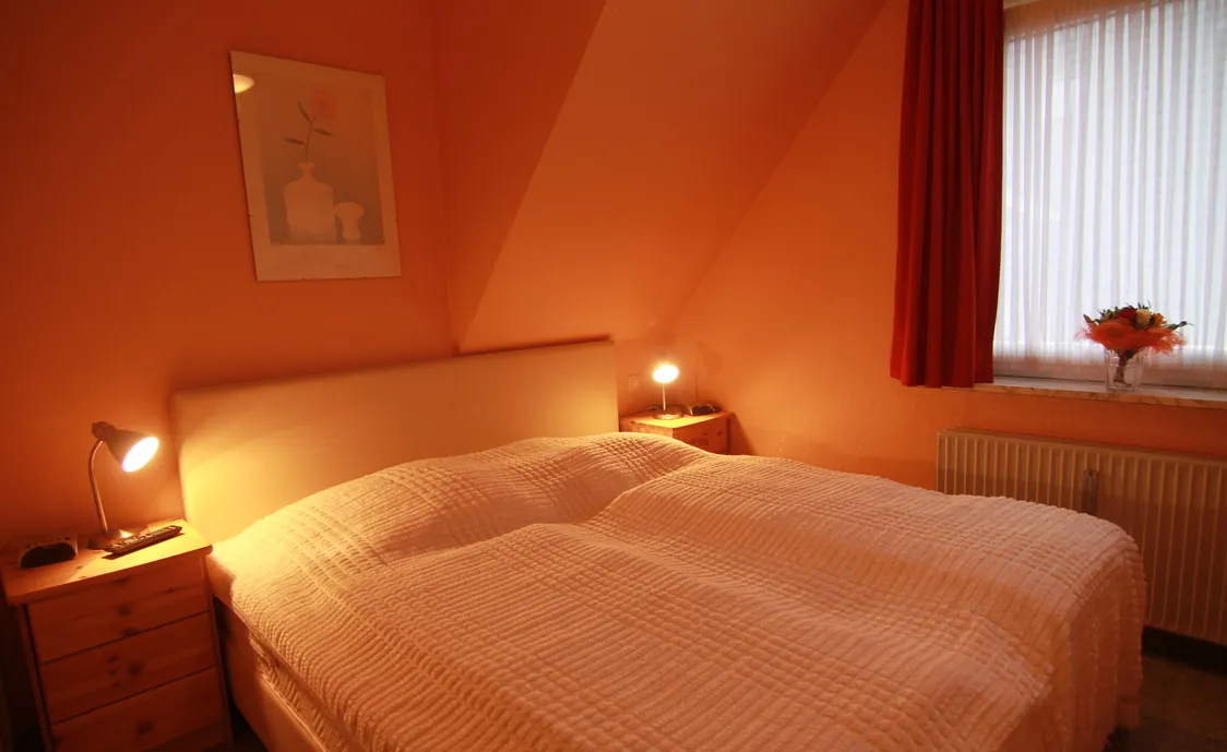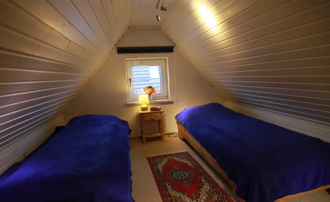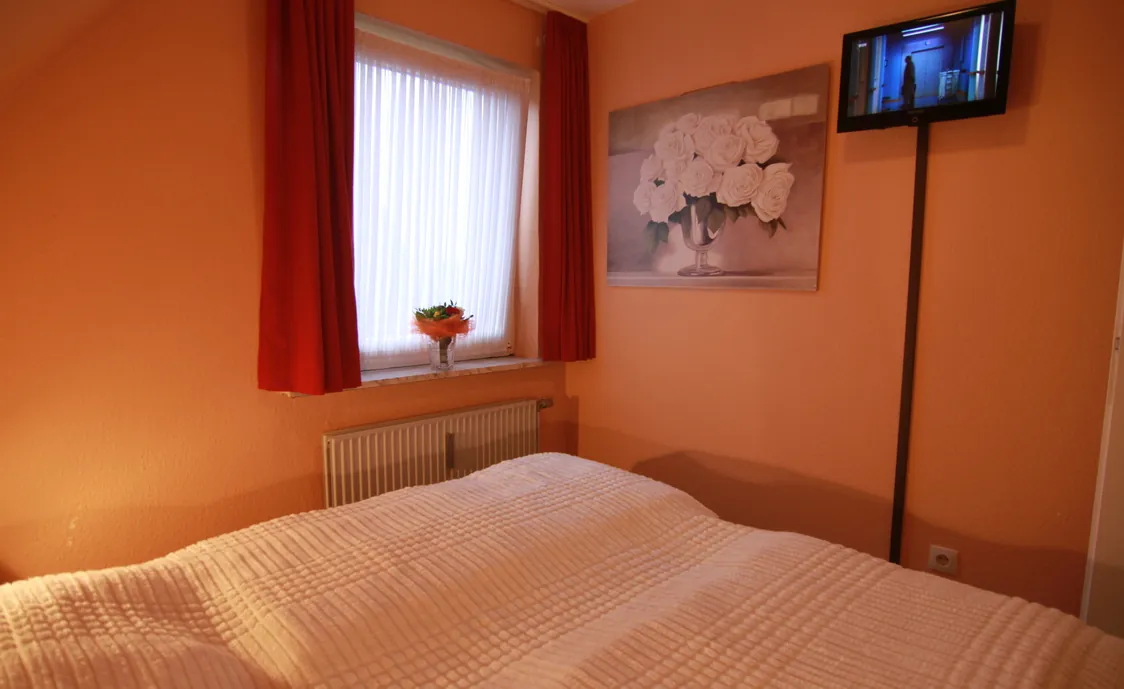 Diese Wohnung im 1. Obergeschoß hat drei Zimmer und bietet Platz für 6 Personen (ein Doppelbett im Schlafraum, ein Schlafsofa im Wohnraum und zusätzlich zwei Einzelbetten im ausgebauten Dachgeschoß mit separatem Fernseher).