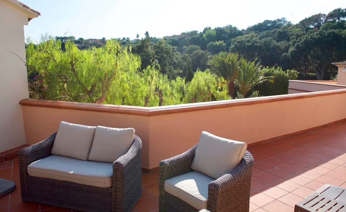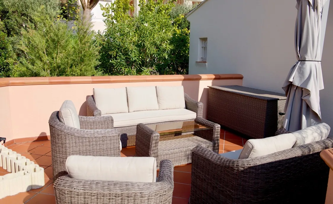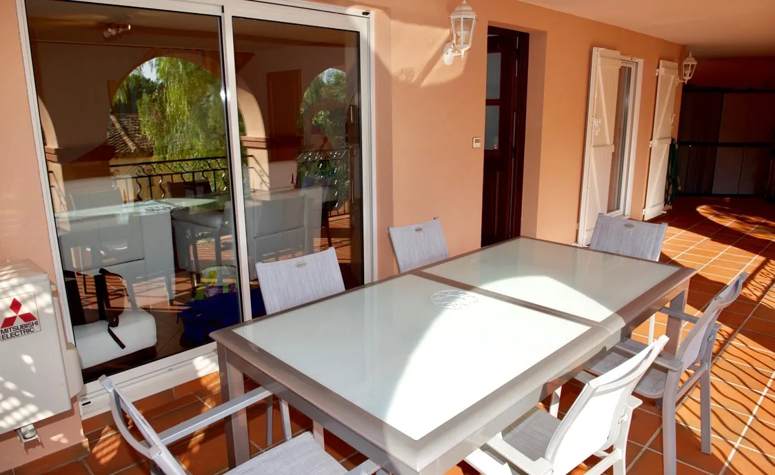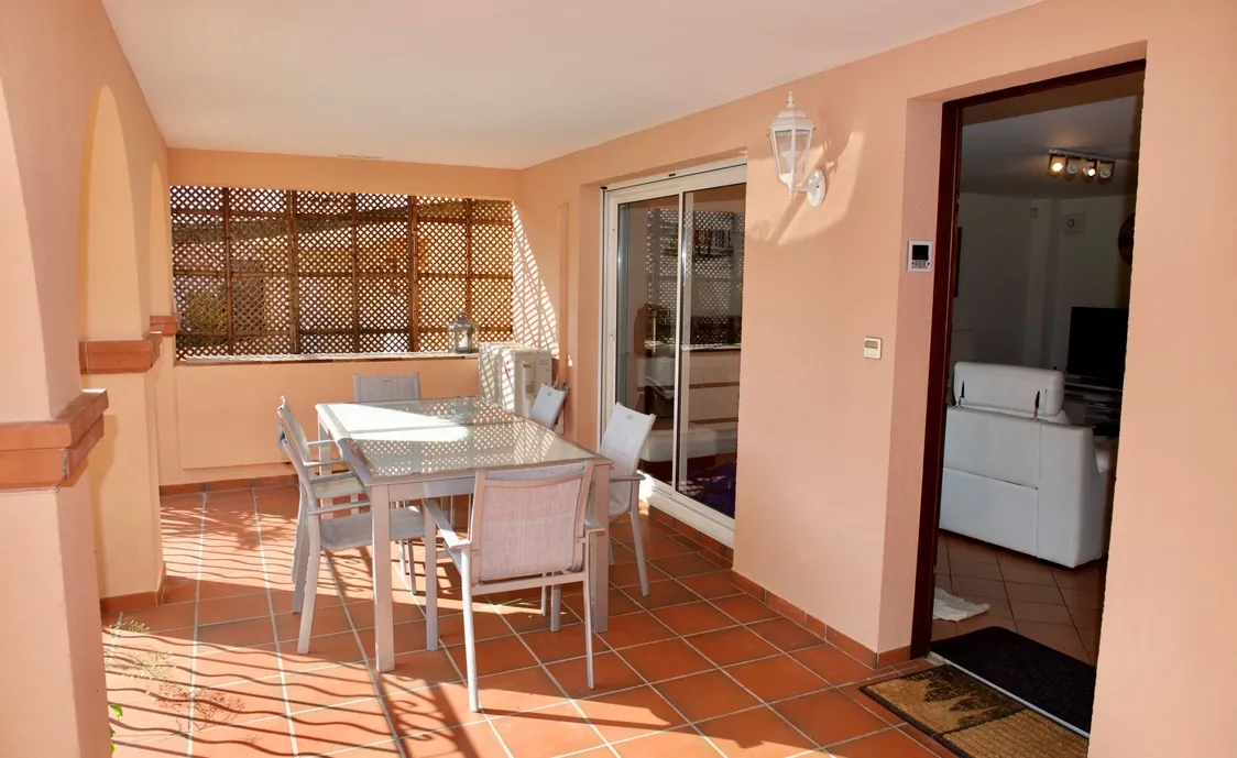 Im Außenbereich befindet sich der Gemeinschaftspool, sowie eine private Terrasse mit Gartenmöbeln und auch eine überdachte Terrasse, auf der Sie wunderbar mit Ihrer Familie zu Abend essen können.