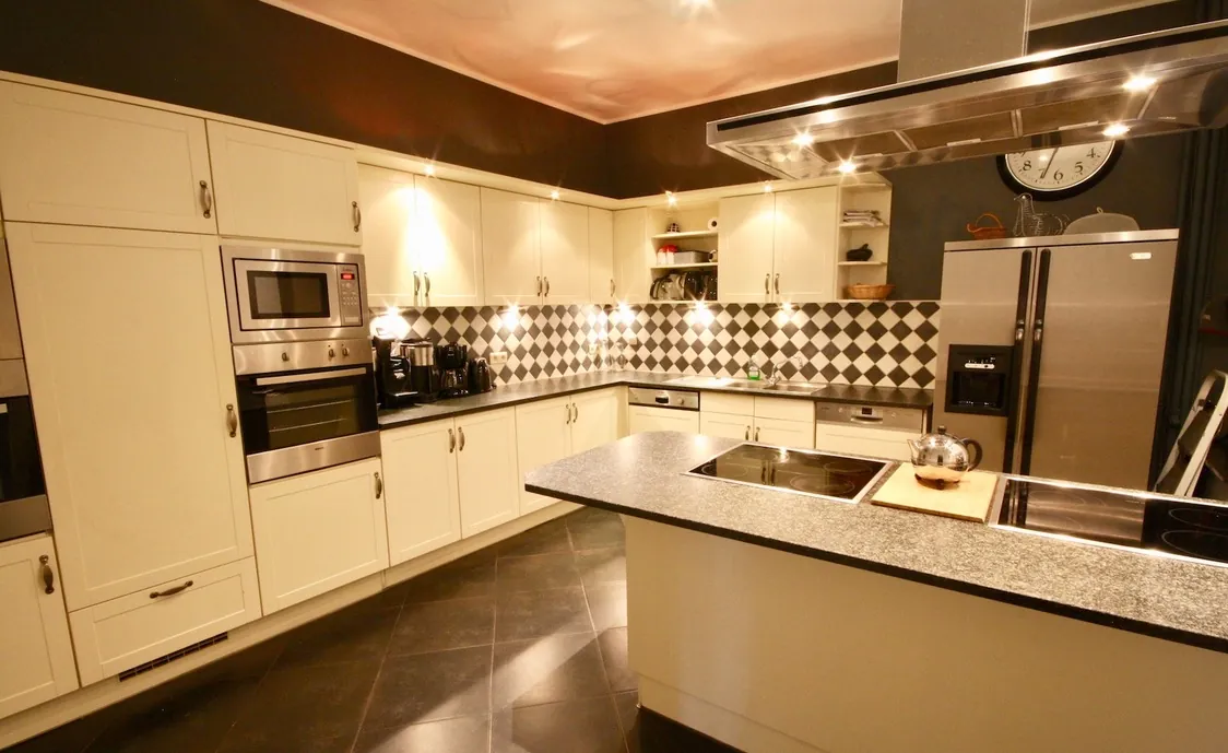 - Ausstattungen: Backofen, Gefrierschrank, Geschirr und Besteck, Geschirrspüler, Kochplatten, Küchenutensilien, Kühlschrank, Mikrowelle, Wäschetrockner, Waschmaschine