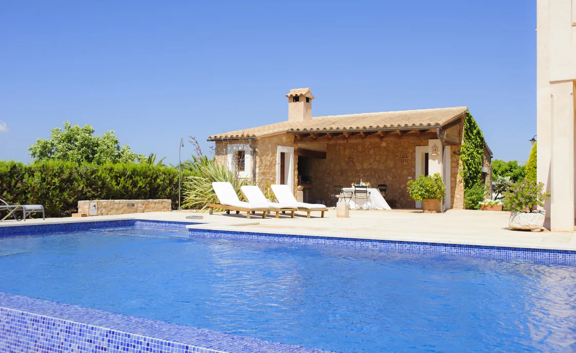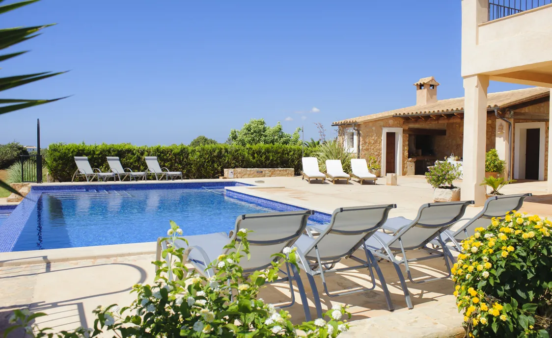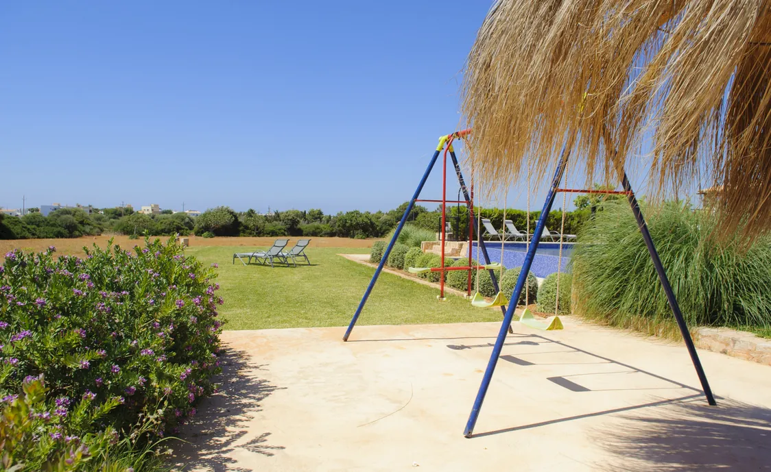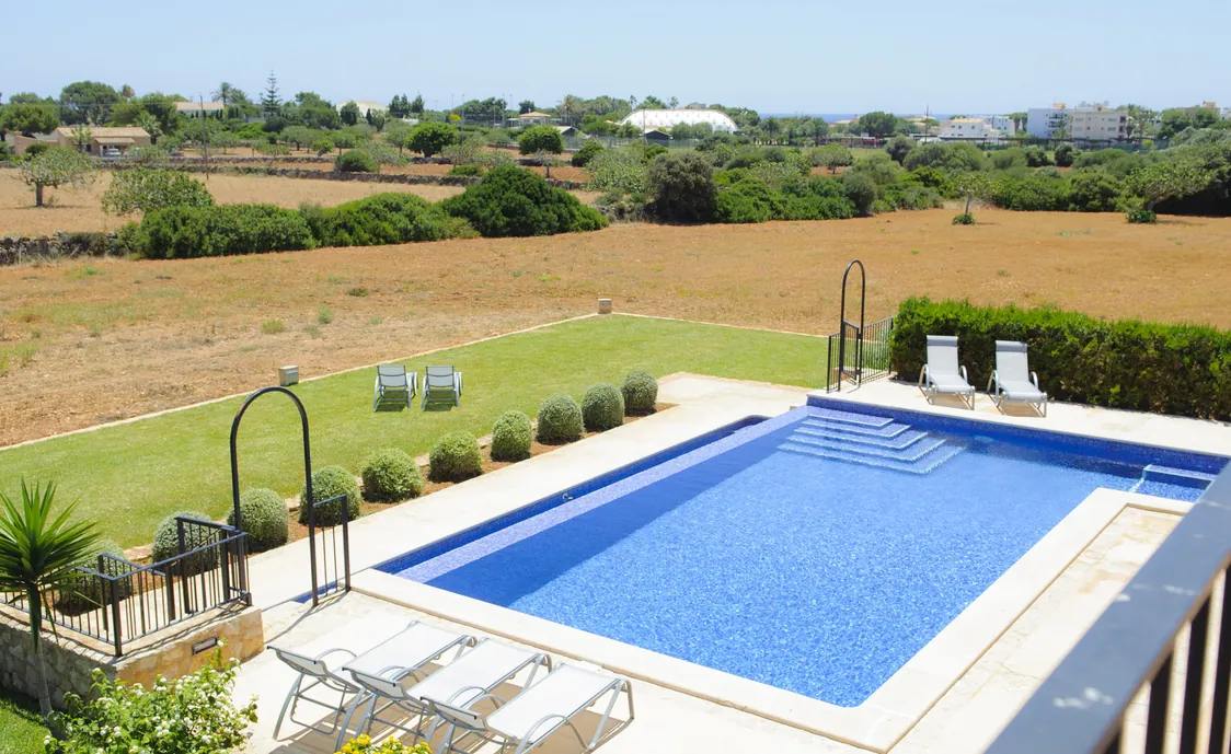 Der kristallklare Pool mit Jacuzzi ist von einer großen Sonnenterrasse umgeben. Hier finden Sie gemütliche Sonnenliegen mit Kissen, Sonnenschirme und eine Außendusche. Es gibt eine Grünfläche auf der die Kinder herumtollen können. In einem kleinem, am Haupthaus angrenzenden Haus gibt es einen Grill, mit Spüle und Gästetoilette. Die große überdachte Terrasse nahe dem Pool lädt zum Entspannen ein. Hinter dem Haus gibt es einen wunderschönen Innenhof, mit einer großen Palme und Sitzmöglichkeiten.