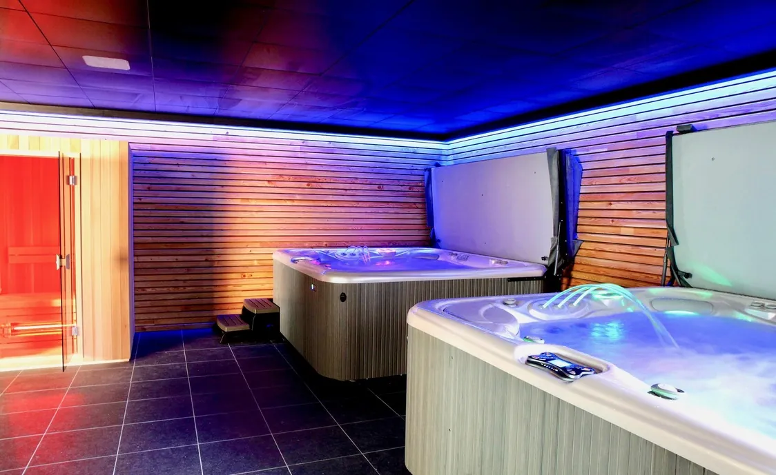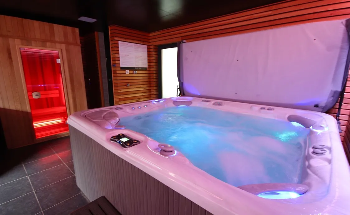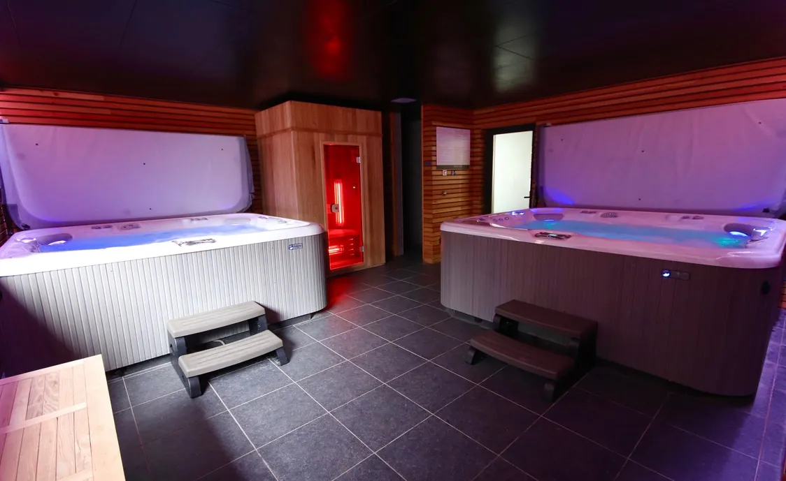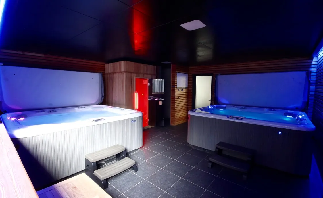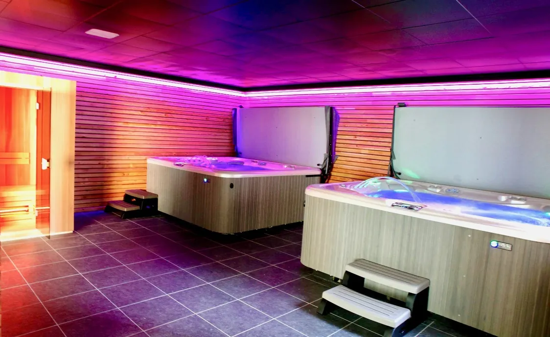 Suite in den belgischen Ardennen mit Außenwhirlpool, der während der Öffnungszeiten des Wellnesszentrums geteilt wird und nach Schließung des Instituts privat genutzt werden kann