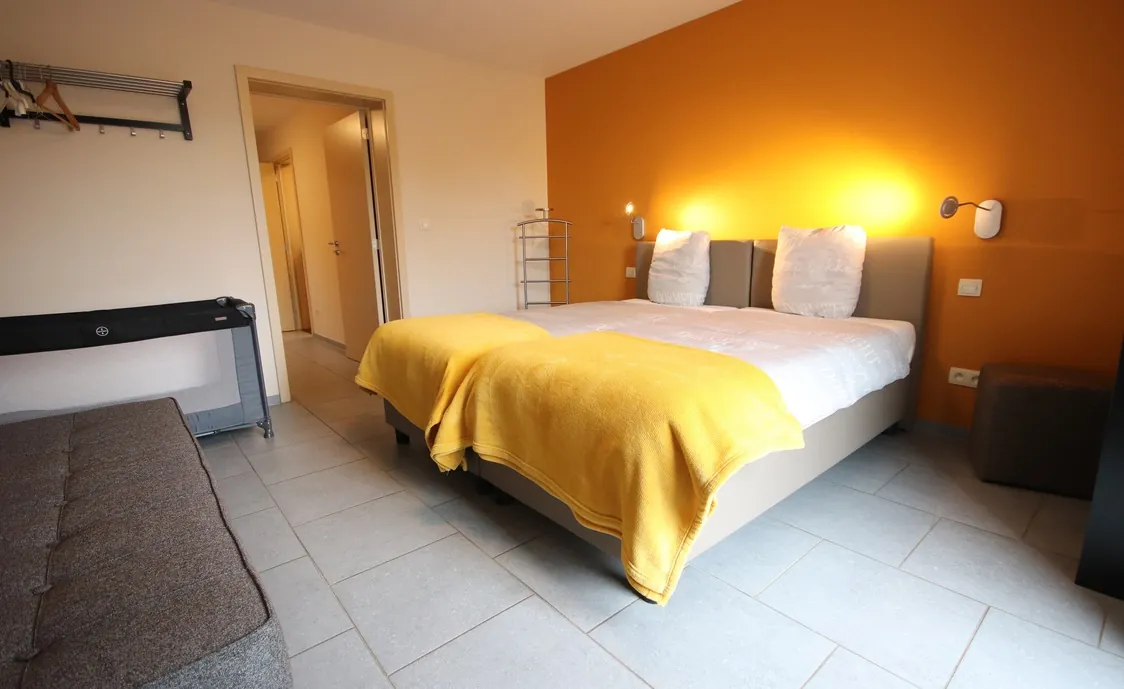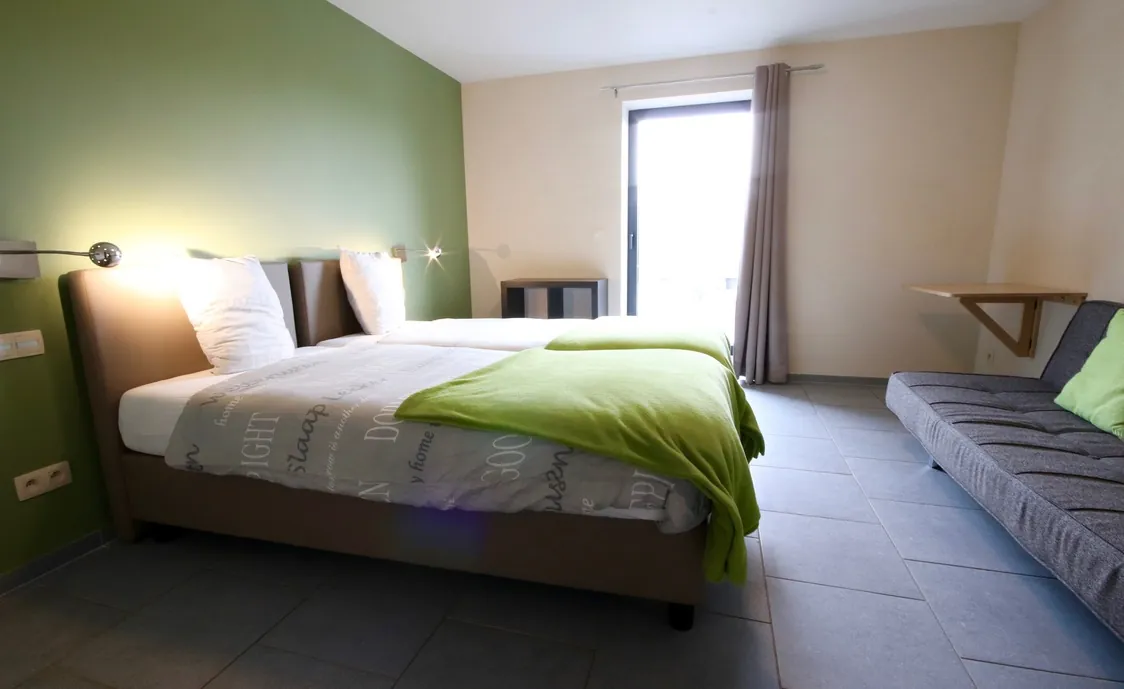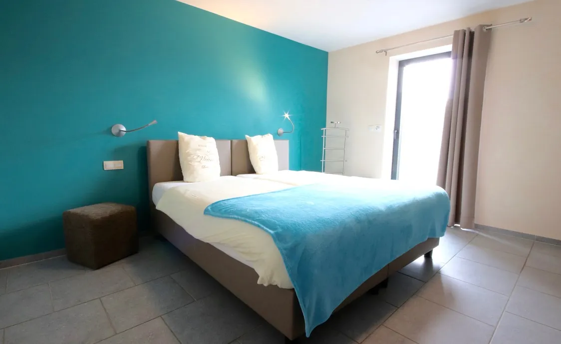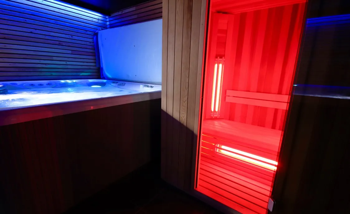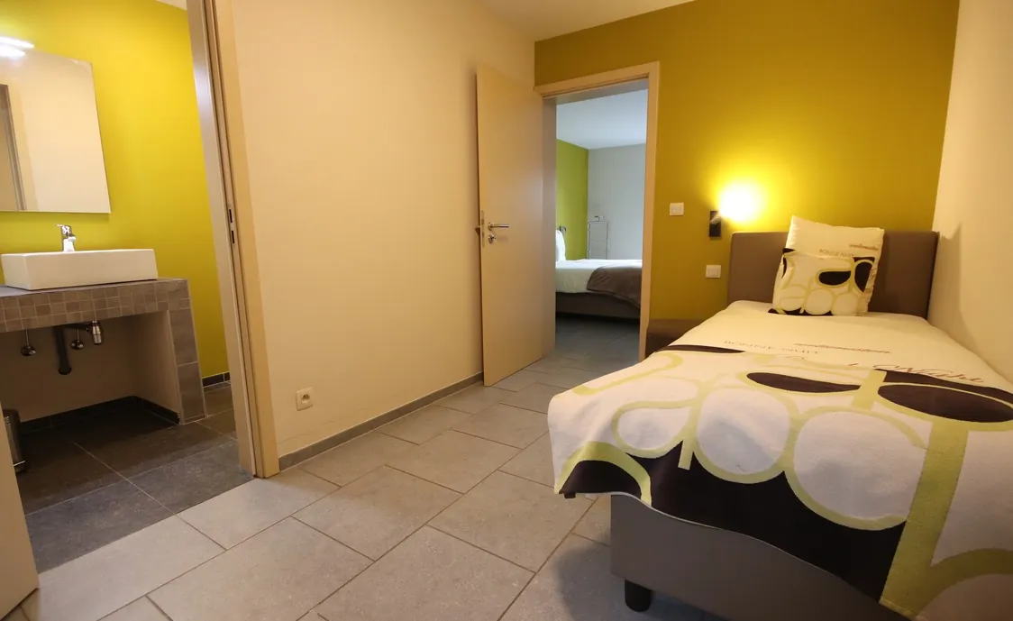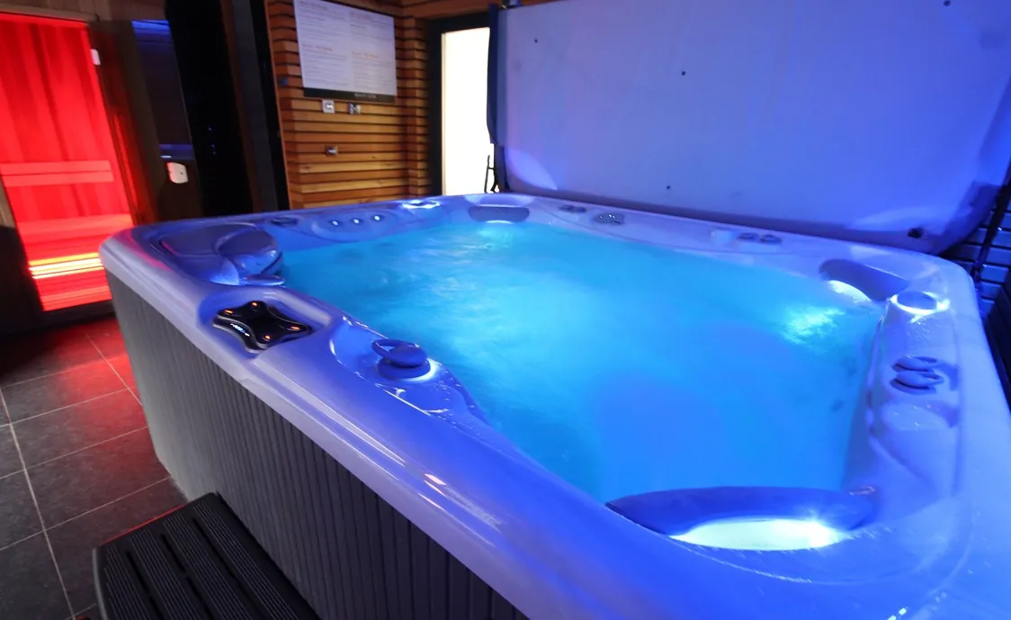 Suite in den belgischen Ardennen mit Außenwhirlpool, der während der Öffnungszeiten des Wellnesszentrums geteilt wird und nach Schließung des Instituts privat genutzt werden kann
